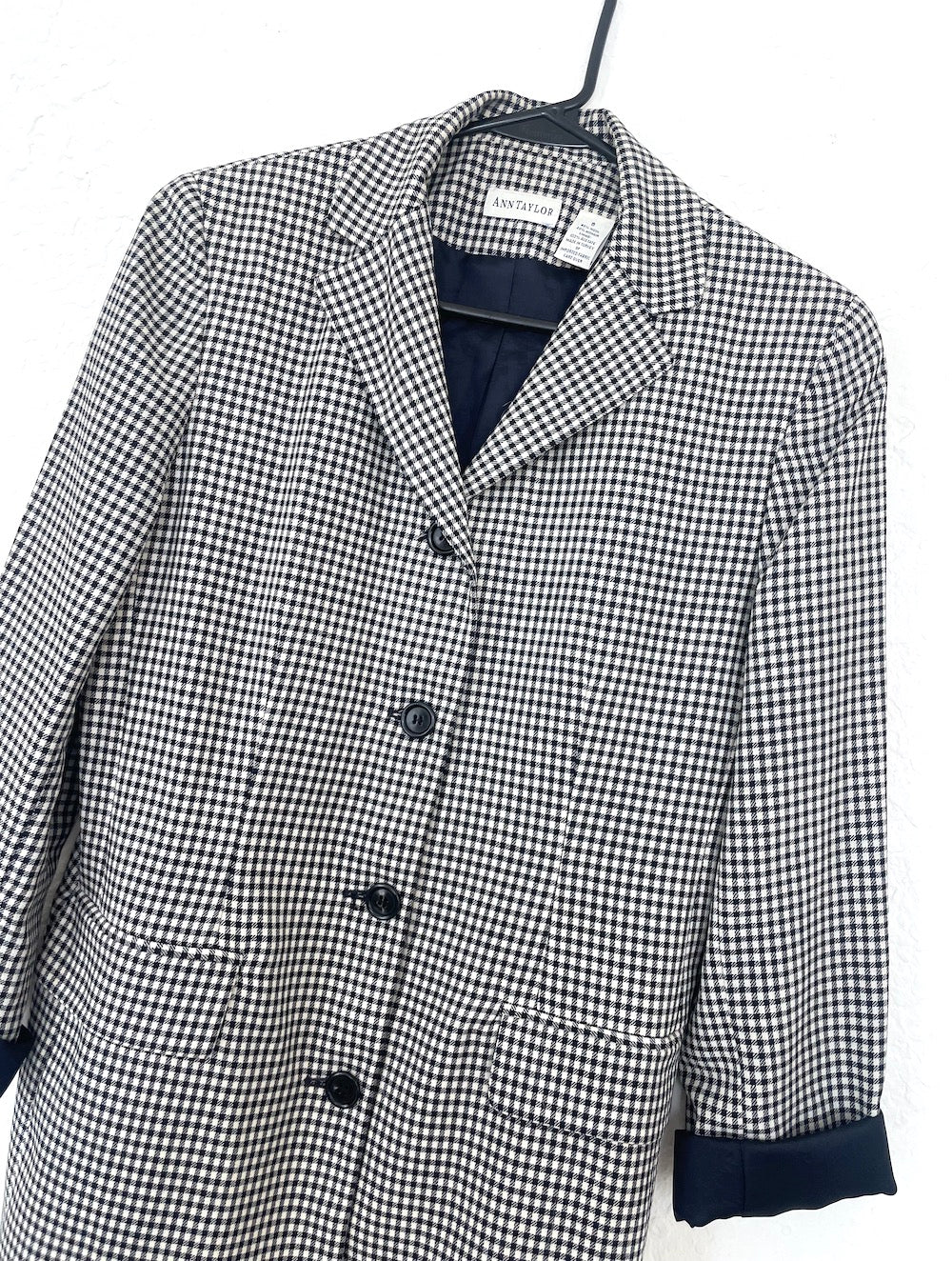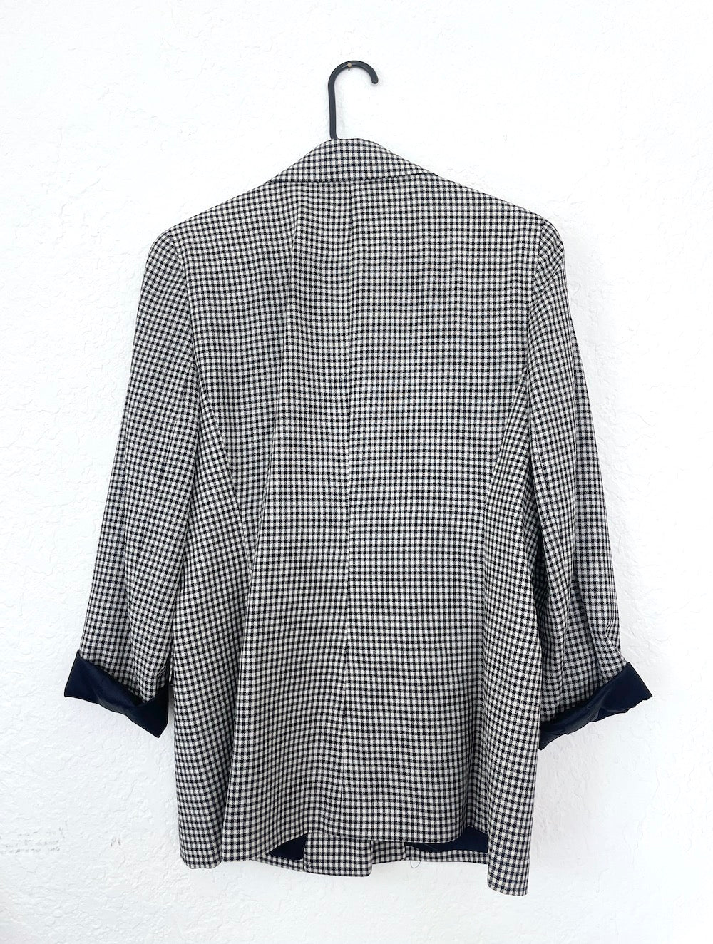 Can never go wrong with a good vintage blazer. Black and white gingham print blazer with silky black lining, two front pockets and four front buttons. Has a slightly oversized fit and small shoulder pads, can be worn with sleeves rolled or long