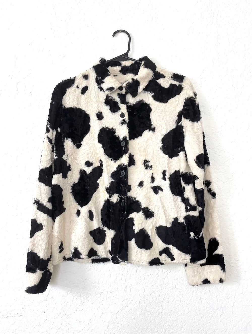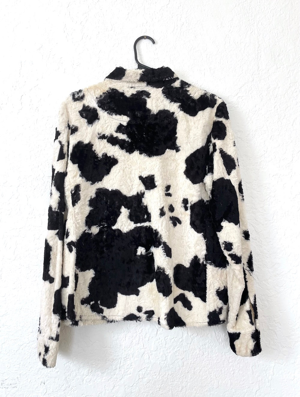 Amazing vintage furry cow print collared button down top with a slightly cropped fit. We love it paired with some booty shorts and tall boots! Marked dry clean only.