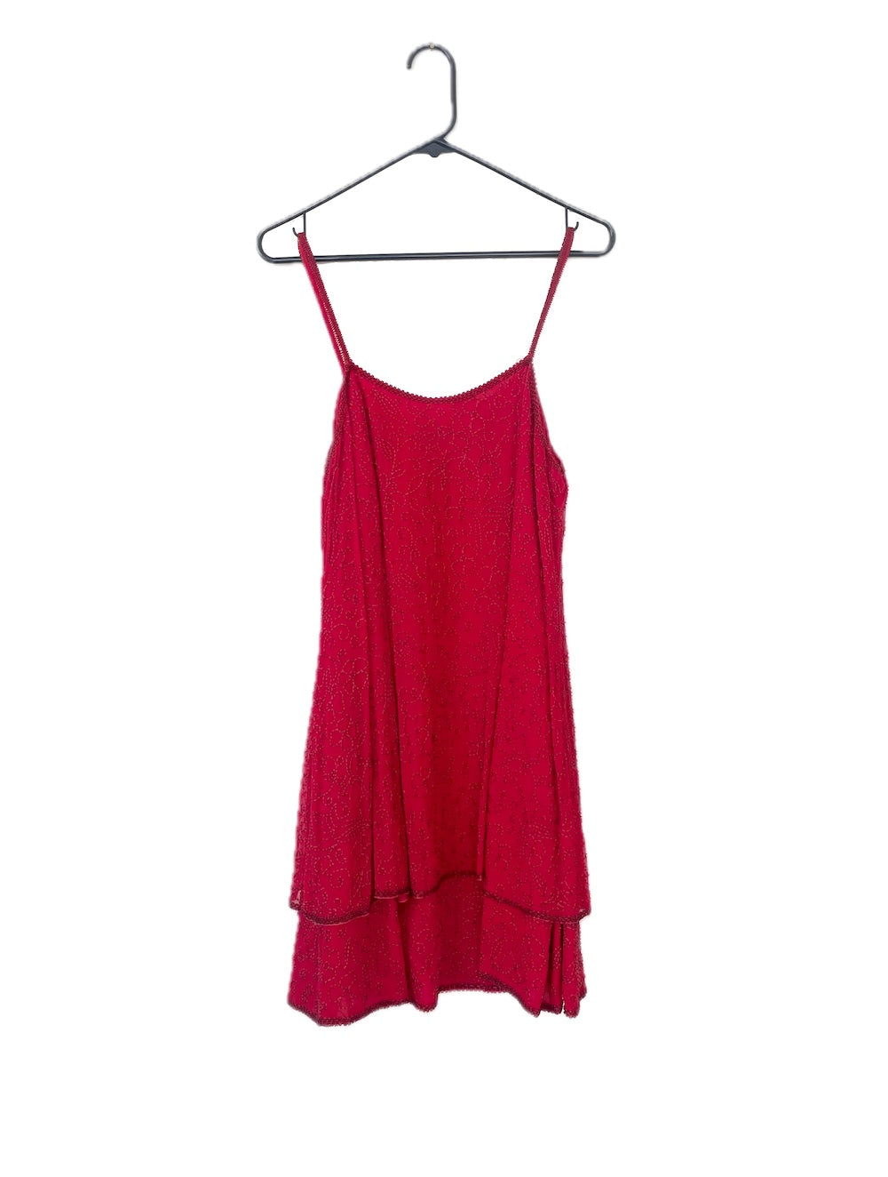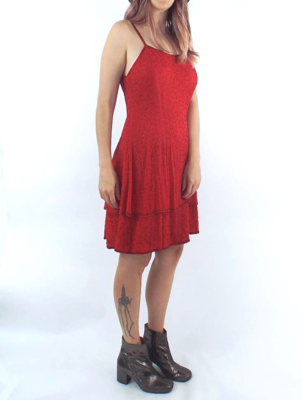 Gorgeous vintage beaded dress in a ruby red color with a double layered bottom and skinny straps. Back has a zipper and clasp closure, model wears a small. Marked as dry clean only.