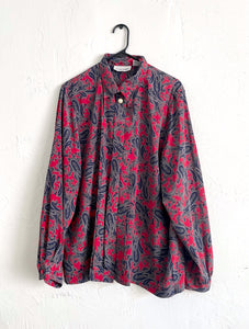 Vintage 80s Silky Red and Blue Paisley Print Faux Pearl Button Down Blouse