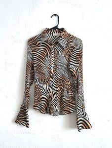 Vintage Y2K Trippy Striped Print Bell Sleeve Print Button Down Top