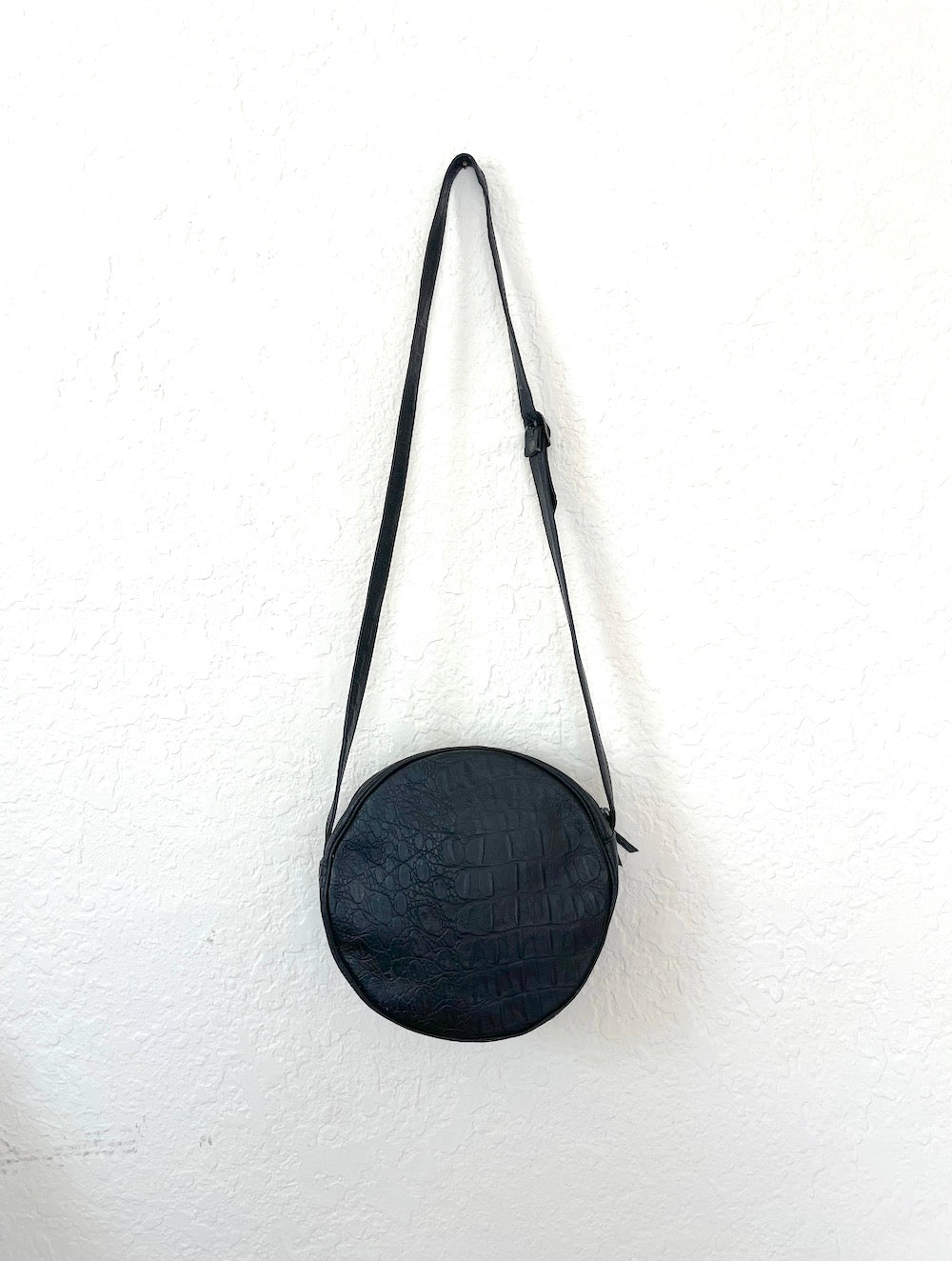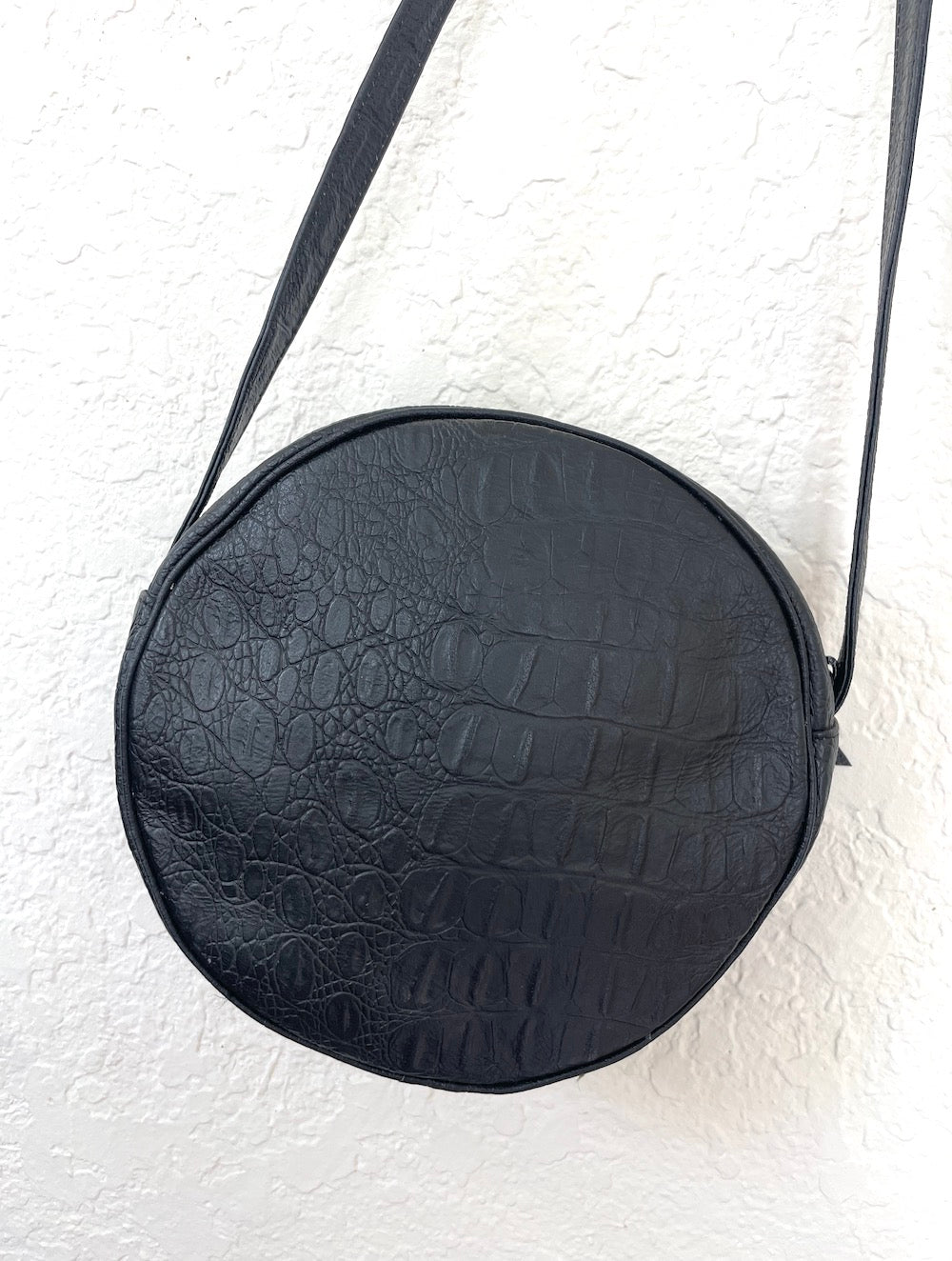 Super cute black vintage round leather purse with an alligator texture. Has one front pocket and a main zippered compartment with one smaller zippered compartment inside. Comes with a note that says animal wrinkles are authentic features.