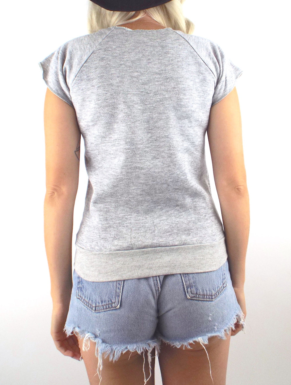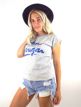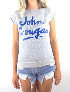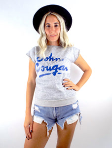 Rad vintage John Cougar Mellencamp sweatshirt in a nice heather grey color with cut off sleeves and a blue and silver design. Top is super soft and thin and sleeves are sewn. Made in the USA!