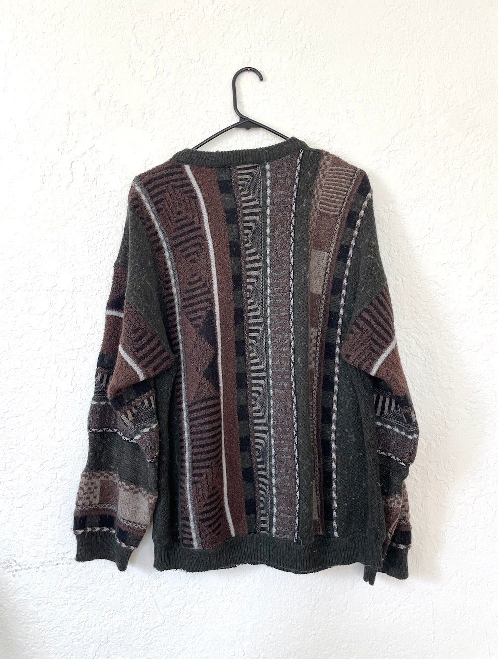 Super cozy vintage crew neck sweater with various geometric designs and contrasting green bands around neck, sleeves and waist. Sweater is oversized and has a nice slouchy fit. Has some pilling throughout.